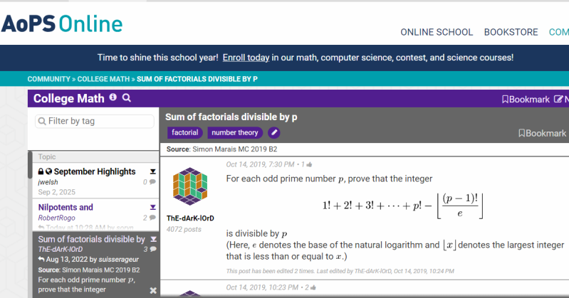 Дальше из диалога с Алисой. Я: Хорошо. Ищи достоверную информацию по проблеме: Sum of Factorials divisible by prime. Только не сочиняй, пожалуйста! Мне нужны конкретные ссылки, где задача была поставлена и где она решалась. Ты поняла? Алиса: Конечно, я готова помочь с поиском конкретной информации! |