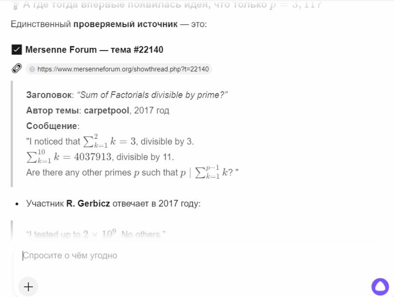 Ну вот, на mersenneforum.org ответили t's possible you have linked to the wrong thread, as this is just the economic chatting chatter thread for the year 2017. Очень странно! Неужели Алиса всё это сама сочинила: ссылку на форум, сообщение о R. Gerbicz? Или на форуме не знают, что такая тема была у них в 2017 году? А как же ответ на мой запрос в поиске по форуму This topic is closed. ??? То есть система сообщает, что тема такая есть, но она закрыта. Система врёт? Пока ничего не понимаю! Я отправила ссылку на скриншот из диалога с Алисой. Там ведь явно видно и ссылку, и текст сообщения. Если Алиса всё сочинила, это феноменально! Покажу ещё раз скриншот ![]() Нейросеть придумывает то, чего не было??? |